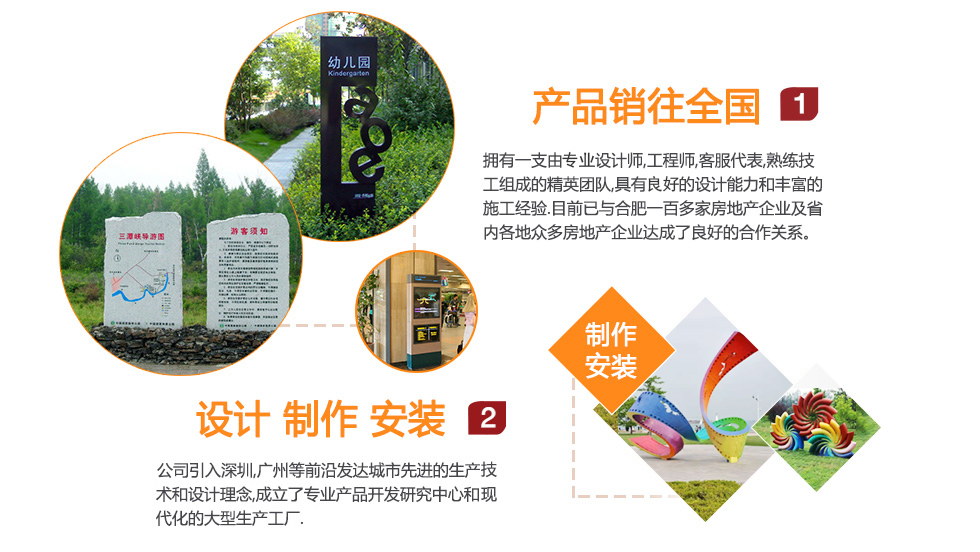 ??合肥匯達標識有限公司成立于2005年3月15日是從事現代標識、雕塑、信報箱、景觀小品等整體規劃,設計,制作及安裝于一體的專業性公司。公司成立了專業的產品技術中心和現代化的大型生產廠房。擁有一支由資深設計師,工程師,客服代表,熟練技工組成的精英團隊,具有一流的設計能力和豐富的施工經驗。目前完成過項目達上千個,已成為了眾多房地產公司 ,建筑建設公司 、園林公司、 設計院所 、裝飾公司、廣告公司的長期供應商。 ??服務過的客戶有萬達 龍湖 綠地 碧桂園 融創 旭輝 祥生 榮盛 高速 寶業等知名地產公司,和順 徽鹽 京東方 安徽名航,中國科學院合肥物質研究院,安徽省水利水電置業發展有限公司等具有國有背景的知名單位和地產公司。完成了安徽合肥濱湖新區綠道標識提升 安徽合肥高新豪生酒店 安徽合肥長江東路憲法主題廣場 安...